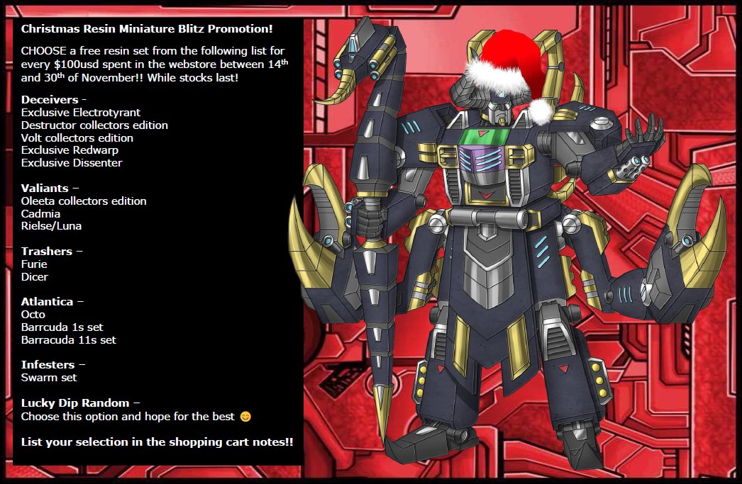 For every $100usd spent in store between 14th and 30th of November 2022, you may choose a miniature to be added free to your packed order from the following list – Deceivers – Exclusive Electrotyrant Destructor collectors edition Volt collectors edition Exclusive Redwarp Exclusive Dissenter Valiants – Oleeta collectors edition Cadmia Rielse/Luna Trashers – Furie […]